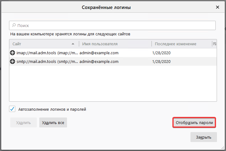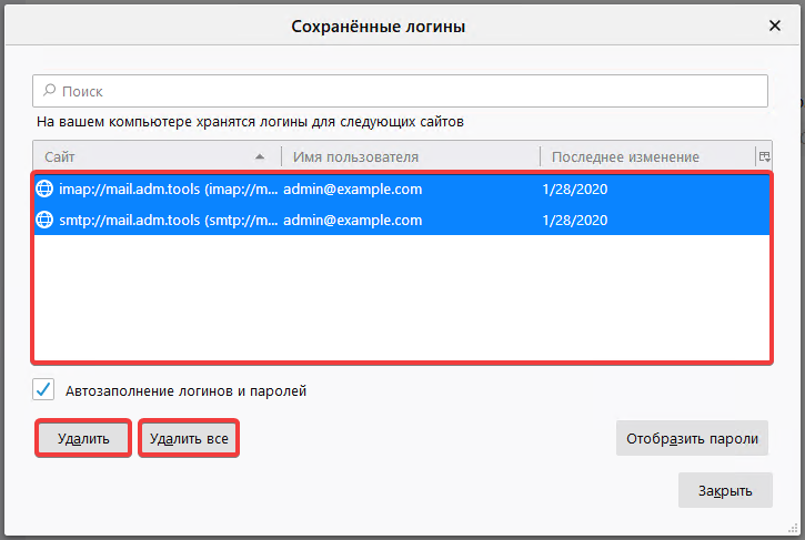 Alternatively, you can in the window «Saved logins» or select the lines with the name of the required mailbox in the list and press «Delete», or, if you need to change the password for all mailboxes added to Thunderbird, use the button «Delete all»: