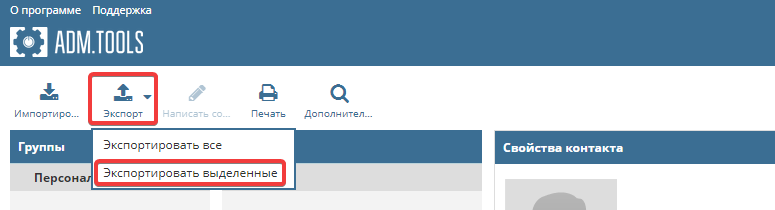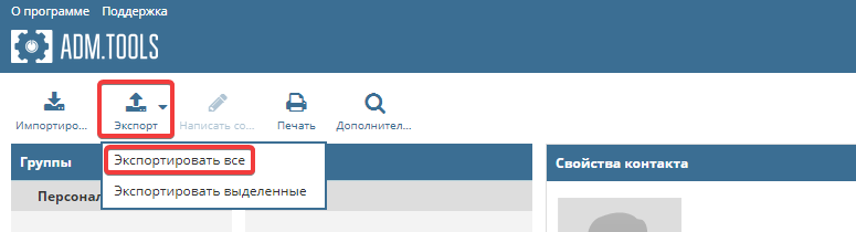 To export all contacts, click on the triangle next to the button «Export» and select «Export all», or on the button itself: