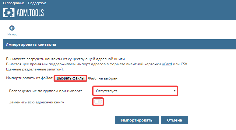 - «Replace entire address book» — leave the option disabled if the imported contacts should supplement existing, or enable it if the imported contacts should replace existing.