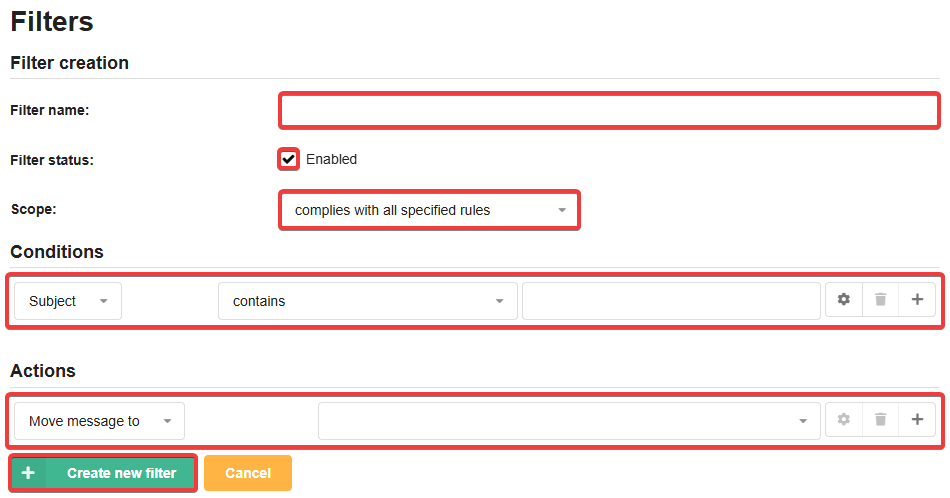 - Specify the name of the filter, the conditions for its triggering, and the actions to be performed when the conditions are triggered: