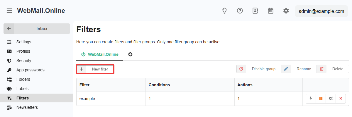 - Open the WebMail.Online settings and go to the "Filters" section.