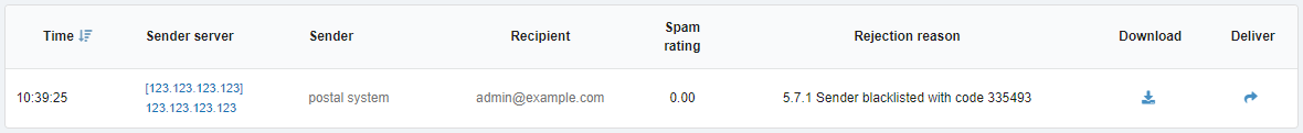 The rejected emails log contains information about messages that were sent to your mailboxes, but were rejected by our mail server for some reason (for example, because the sender was in the blacklist or exceeded space for mail). The log is located in the "Rejected emails" section.