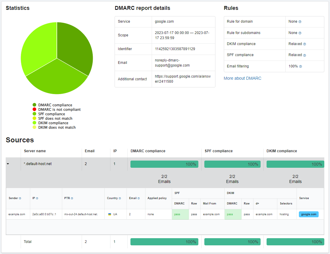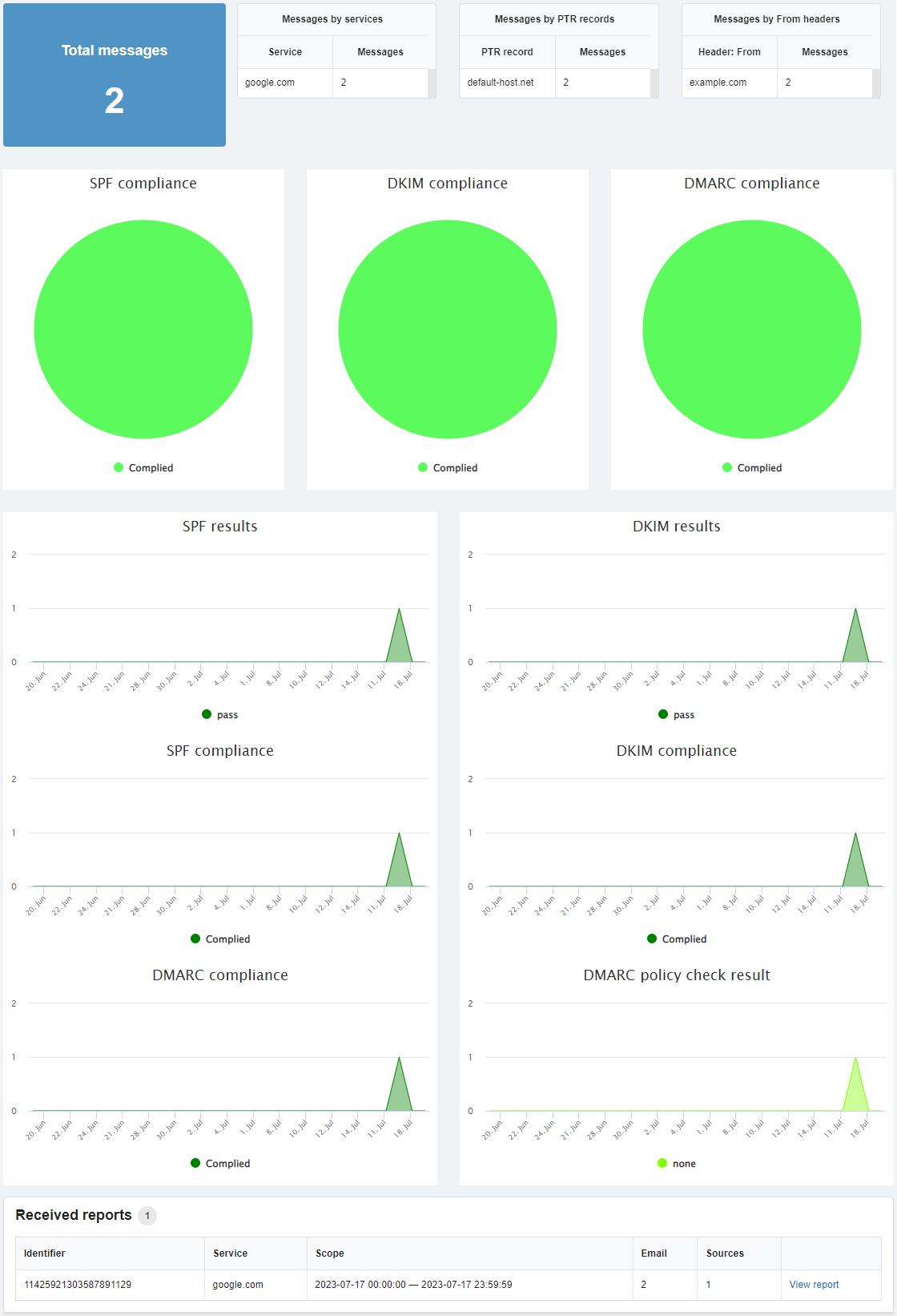 Charts with daily statistics for the last month on SPF, DKIM and DMARC — how many messages passed validation, how many didn't, etc.