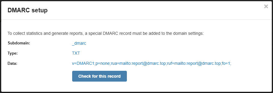 Subdomain Type Data _dmarcTXT v=DMARC1;p=none;rua=mailto:report@dmarc.top;ruf=mailto:report@dmarc.top;fo=1; - Add DNS record with this data in the domain settings.