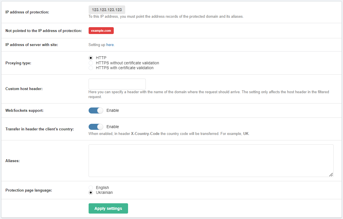 IP address of protection. This is the address that must be specified in the domain and alias address records for traffic to pass through the protection server.