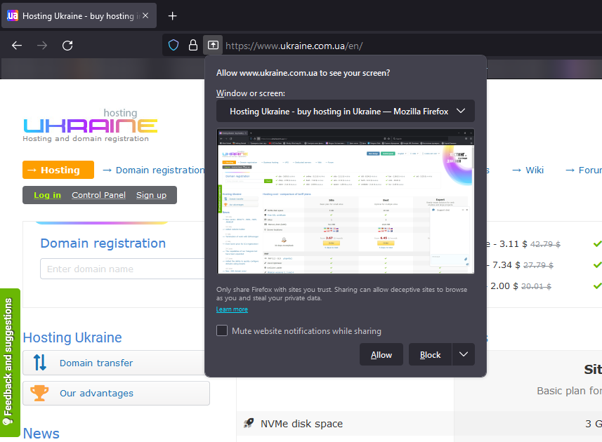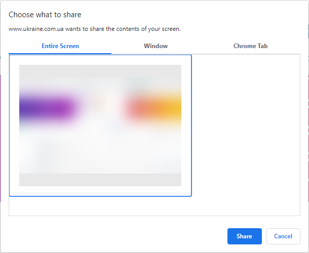Select what you want to send (a screenshot of the entire screen, a separate window, or a browser tab), click "Share", and wait a few seconds (the screenshot is taken with a slight delay):